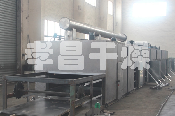 物料由加料器均勻地鋪在網帶上,網帶一般采用12-60目不銹鋼絲網,由傳動裝置拖動在干燥機內移動。干燥機由若干單元組成,每一單元熱風獨立循環,部分尾氣由專門排濕風機排出,廢氣由調節閥控制,熱氣由下往上或由上往下穿過鋪滿物料的網帶完成熱量與質量傳遞的進程,帶走物料水份。網帶緩慢移動,運行速度可根據物料溫度自由調節,干燥后的成品連續落入收料器中。上下循環單元根據用戶需要可靈活配備,單元數量亦可根據需要選取。