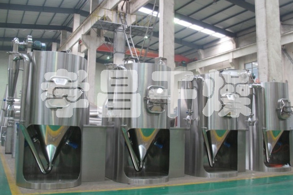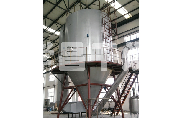空氣經過過濾和加熱,進入干燥器頂部空氣分配器,熱空氣呈螺旋狀均勻地進入干燥室。料液經塔體頂部的高速離心霧化器(旋轉)噴霧成極細微的霧狀液珠,與熱空氣并流接觸,在極短的時間內可干燥為成品。成品連續地由干燥塔底部和旋風分離器中輸出,廢氣由風機排空。